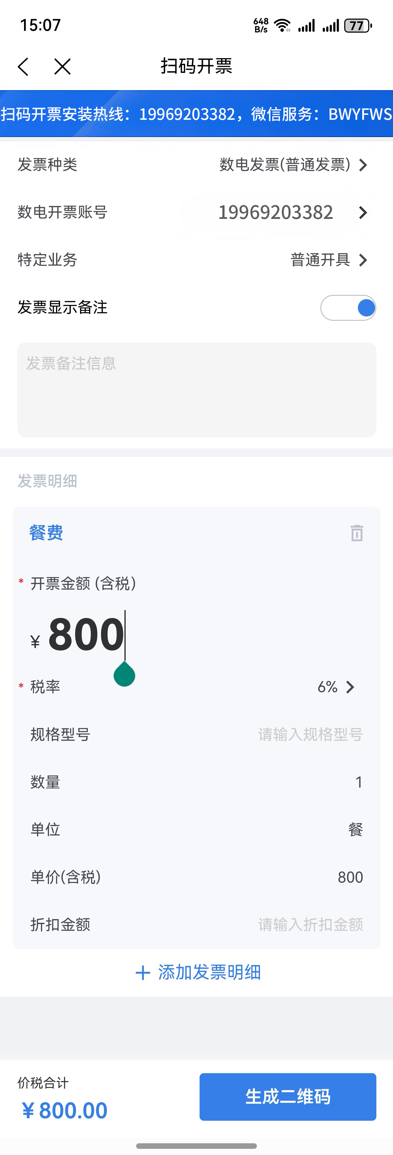 1、商家的操作:扫码开票,输入开票金额,生成二维码;